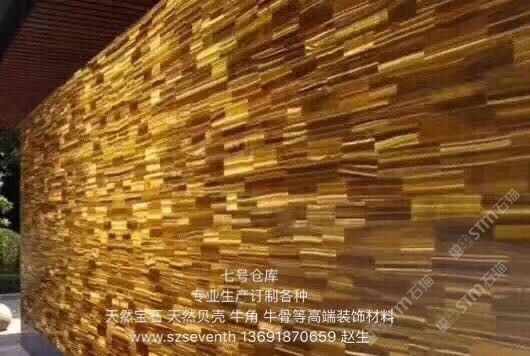 公司簡介: 深圳市七號倉庫裝飾材料有限公司是一家以世界各地名貴珍珠母及世界各地名貴寶石為原材料(例如:新西蘭鮑魚貝、澳洲白蝶貝、印尼黃碟貝、大溪地黑蝶貝、美國的分紅貝、印尼的企鵝貝、南太平洋的牛耳貝、中國河貝;非洲的虎眼石、巴西的瑪瑙、美國的水晶、緬甸的藍(lán)紋石、朝陽的木花石等等)專業(yè)生產(chǎn)貝殼馬賽克、貝殼密拼板、貝殼雕花背景墻、各種寶石裝飾板的綜合性企業(yè)。我們致力于把純天然珍珠母貝迷人的質(zhì)地和名貴寶石的高端奢華,通過名家大師的精心設(shè)計和我們專業(yè)的加工,讓產(chǎn)品“而浪漫,奢華而自然”。 產(chǎn)品廣泛應(yīng)用于酒店、別墅、會所、KTV、樣板房、家居及家俬鑲嵌等裝飾。我們致力打造“七號倉庫”為品牌,在江西有近100000平米的生產(chǎn)基地及專業(yè)的生產(chǎn)團(tuán)隊(duì),年生產(chǎn)各類貝殼及各類寶石裝飾材料近20000平方米,我們與世界各地貝殼及各類寶石的原材料供應(yīng)商保持長期穩(wěn)定的合作,以保證原材料的充分供應(yīng)。公司在深圳設(shè)有專門的銷售團(tuán)隊(duì),并擁有進(jìn)出口權(quán)可以為海外客戶提供便捷的進(jìn)出口業(yè)務(wù)。 “七號倉庫”始終秉承“學(xué)習(xí)創(chuàng)新,誠信”的經(jīng)營理念,熱情細(xì)心的服務(wù)態(tài)度,同時不斷引進(jìn)國外先進(jìn)的生產(chǎn)技術(shù)和設(shè)備,結(jié)合傳統(tǒng)的工藝,并以優(yōu)惠的價格和準(zhǔn)確的貨期滿足客戶要求,歡迎世界各地新老客戶來電洽談。 貝殼密拼裝飾板及寶石裝飾板應(yīng)用范圍: 貝殼密拼裝飾板和寶石裝飾板作為一種新型的裝飾材料,有著其獨(dú)特性。原材料純天然的原生態(tài)的性質(zhì),可供觀賞,抗壓耐磨,風(fēng)格獨(dú)特,具有一定的收藏價值。 經(jīng)過十幾年來的創(chuàng)新和使用,可以廣泛應(yīng)用于酒店、別墅、會所、樣板房、寫字樓,商務(wù)樓、KTV、家庭等裝修裝飾等場所。 例如:電視機(jī)背景、床頭背景、浴室墻面、酒店大堂墻面、地面、電梯內(nèi)外墻、接待臺、玄關(guān)背景墻、天花背景、洗浴中心,吧臺,桌(臺)面,家具家私鑲嵌等等。