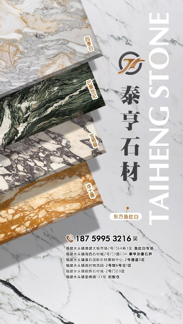 泉州泰亨石材有限公司,辦公地點(diǎn)位于中國(guó)石材之都—南安水頭。經(jīng)營(yíng)產(chǎn)品有:東方魚(yú)肚白(自有礦山),四季白,巴黎世紀(jì),寶格麗,浮士德,布達(dá)拉灰(自有礦山),星空灰(自有礦山)、雅蘭云天(包礦)、蘋果灰(包礦)、銀鉆咖啡(包礦)、魚(yú)肚白、雪花白、藍(lán)金沙白金沙系列、帕斯高灰、意大利木紋、意大利,西班牙原裝進(jìn)口巖板(中國(guó)總代理)、國(guó)產(chǎn)巖板(福建總代理)、黃斑石、意大利木紋、銀鉆咖啡,魚(yú)肚灰等優(yōu)質(zhì)品種。我們以經(jīng)驗(yàn)豐富的采購(gòu)團(tuán)隊(duì),熱情專業(yè)的銷售團(tuán)隊(duì)和執(zhí)著細(xì)致的技術(shù)團(tuán)隊(duì),為客戶提供精致的產(chǎn)品,售前售后服務(wù)和技術(shù)支持。本著為客戶負(fù)責(zé)的態(tài)度,經(jīng)過(guò)多年的潛心經(jīng)營(yíng),泰亨石材在石材業(yè)界樹(shù)立了良好的信譽(yù)。如果您對(duì)我司的產(chǎn)品服務(wù)有興趣,歡迎在線留言或來(lái)電來(lái)函咨詢,泰亨石材在追求美的路上與您一路同行。