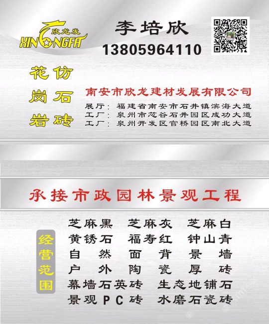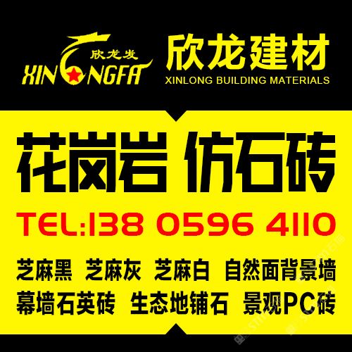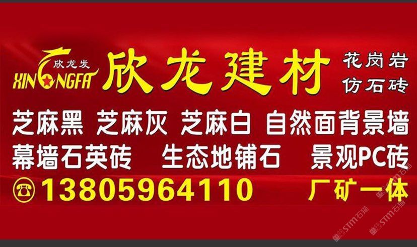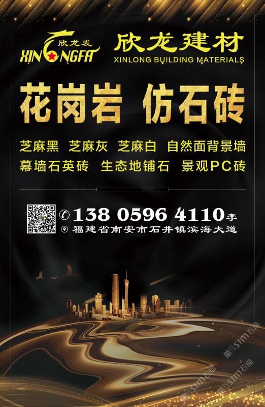 南安市欣龍建材發(fā)展有限公司,位于建材之鄉(xiāng)—福建省南安市石井鎮(zhèn),公司旗下?lián)碛袃纱笾髁Ξa(chǎn)品:花崗巖?仿石磚。(一)花崗巖:廠礦一體,荒料?大板?成品精加工,一站式供應(yīng)。擁有芝麻黑、芝麻灰、芝麻白、銹石、蝦紅、小藍(lán)寶、藍(lán)寶石、泉州紅、永定紅、福壽紅、福建青、鐘山青、喬治亞灰、G606、G617等品種,承接幕墻干掛、園林景觀、市政廣場(chǎng)、機(jī)場(chǎng)高鐵、別墅豪裝、酒店精裝、異形雕刻、自然面背景墻等工程。為石而生,匯聚石尚生活! (二)仿石磚:戶外陶瓷厚磚,接受客戶需求定制。不是石材,更勝石材!抗壓強(qiáng)度高、抗凍性能好、防滑耐磨、綠色環(huán)保。擁有幕墻石英磚、生態(tài)地鋪石、景觀PC磚、環(huán)保熔巖板、陶瓷透水磚、水泥PC磚等系列產(chǎn)品。采用先進(jìn)的技術(shù)與工藝,融匯東西方精粹,不斷創(chuàng)新,將不同文化風(fēng)尚及搭配方式重新組合設(shè)計(jì),開發(fā)現(xiàn)代新穎的產(chǎn)品,造就逼真無瑕的自然外觀質(zhì)感,滿足全球客戶不斷發(fā)展的個(gè)性化需求。產(chǎn)品廣泛應(yīng)用于園林小區(qū)、商業(yè)地產(chǎn)、公園廣場(chǎng)、市政道路、高鐵地鐵、酒店賓館、居家庭院、步行街、寫字樓、度假村、機(jī)場(chǎng)、學(xué)校、醫(yī)院、綠道等干掛鋪裝場(chǎng)所。因?yàn)閷Wⅲ詫I(yè)!