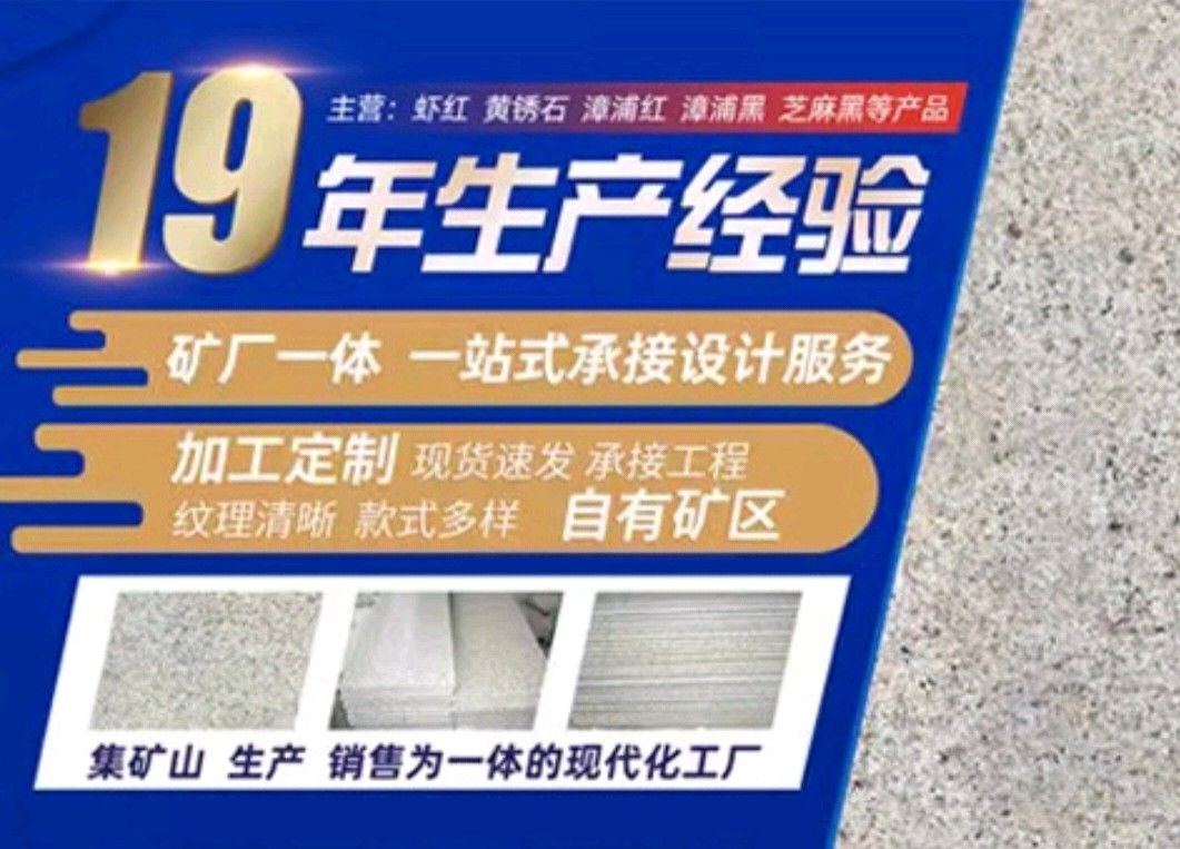 漳浦縣鴻勝石材有限公司是一家集礦山開采、自營加工生產(chǎn)、自主產(chǎn)供銷為一體的石業(yè)公司,公司擁有數(shù)家生產(chǎn)基地、手工加工場(chǎng)、大型礦山。公司創(chuàng)業(yè)歷程10年,憑著豐富的加工生產(chǎn)經(jīng)驗(yàn)、雄厚的技術(shù)力量和先進(jìn)的設(shè)備,產(chǎn)品遠(yuǎn)銷歐美、韓國、新加坡、臺(tái)灣等地,深受客戶的信賴與好評(píng)。 本公司產(chǎn)品主要有: 漳浦紅,漳浦黑,漳浦青,漳浦蝦紅,漳浦銹石,福建青,安山巖,芝麻黑,芝麻灰,沙漠棕等。
