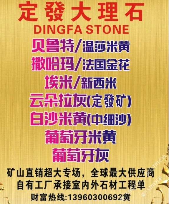 發(fā)布信息: 貝魯特/溫莎米黃,工程外墻干掛? 葡萄牙米黃/葡米,工程外墻干掛★ 撒哈瑪/法國金花,室內(nèi)外材料?? 埃米、新西米,超白低室內(nèi)外材料★ 云朵拉灰,專為工程而打造,超性價比 白沙米黃/中細(xì)沙,室內(nèi)外材料?? 令每個工程交付,做到驗(yàn)收無憂???? (質(zhì)與量的保障者、經(jīng)得起層層考驗(yàn))???? 全球供應(yīng)商,各大地產(chǎn)指定供應(yīng)商? 承接國內(nèi)外室內(nèi)外石材工程訂單???? 致富專線:13960300692黃