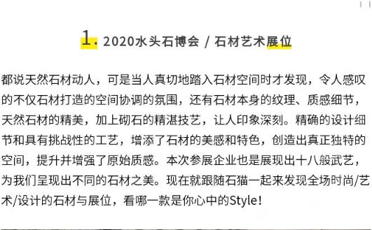 2020水頭石博會(huì),石貓與你發(fā)現(xiàn)石材藝術(shù)展位!