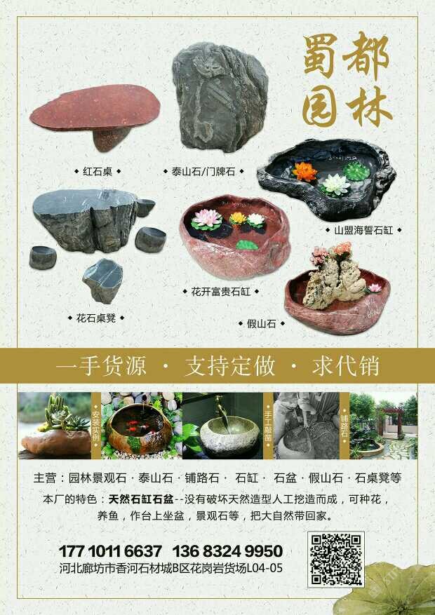發(fā)布信息: 蜀都園林專營(yíng)泰山石,天然石頭花盆魚缸石槽,石桌凳,鋪路石等,花崗巖中國(guó)紅臺(tái)灣紅專營(yíng),一手貨源,支持定做,求代銷13683249950