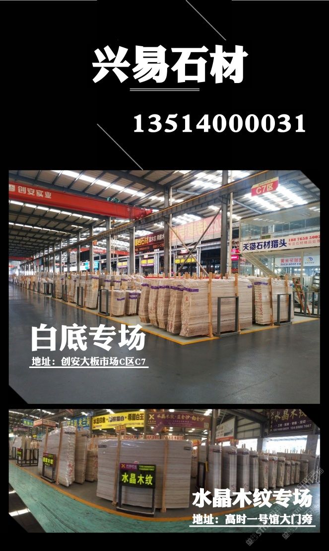 發(fā)布信息: ? ? ? 【興易大理石】 ? ? 白底水晶木紋專場 ? 我司主營水晶木紋系列產(chǎn)品: 水晶木紋,翡翠木紋,國產(chǎn)藍金沙,白金沙,彩虹木紋 ? 滿倉白底水晶木紋新料任選, 條板,大板 荒料均有售,統(tǒng)一花色,防水背膠供應! 部分礦口特惠,歡迎撿漏 歡迎新老客戶來電垂詢! ? ?地址: ? 濱海高時物流一號館大門旁 ? 創(chuàng)安c區(qū)c7區(qū)興易石材 ? 電話:13514000031小李 ? ?