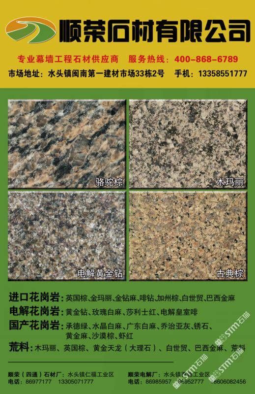 發(fā)布信息: 專注庫邦綠,河流白,威斯康白,皇家翠玉,白玫瑰,白世貿(mào),格麗莎,白沙,太古世紀,貝金米黃,月光米黃水晶白,維多利亞綠,等各種輕奢風幕墻石材,金山麻,巴西金,紫點金麻,蘭眼睛,電解板,異形線條等工程石材13358551777許,13305071777蔡。 工廠址:水頭鎮(zhèn)仁福工業(yè)區(qū)順榮石材