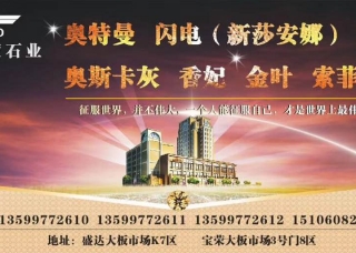 奧輝石業(yè)主營產(chǎn)品:奧斯卡灰,愛馬仕灰2,奧斯卡灰1,閃電灰,金灰,金灰1企業(yè)地址:福建南安水頭鎮(zhèn)東星大板市場(chǎng)6號(hào)門3通道10區(qū)