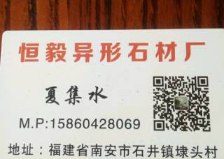 恒毅石材工業(yè)主營產(chǎn)品:石島紅(老8號(hào)),688,657銹石,639,G606(正礦),泉州白,永定紅(光面),芝麻黑654(新礦)企業(yè)地址:福建南安石井鎮(zhèn)埭頭村